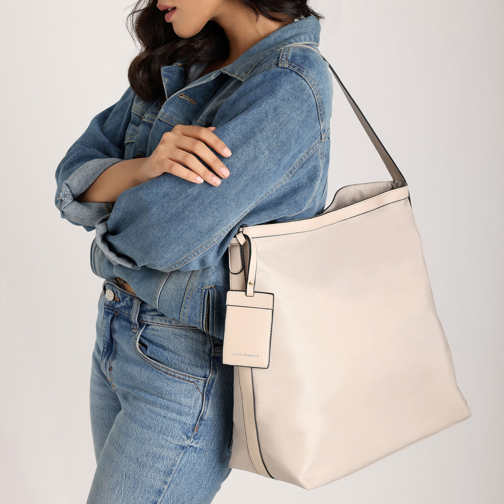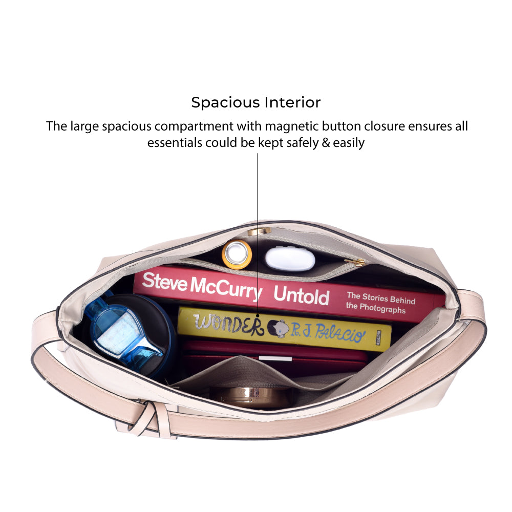 Inside, you’ll find a spacious interior with two internal pockets and a secure zip compartment to keep your essentials organized without clutter. The subtly structured base adds stability without compromising its laid-back vibe. Its neutral beige tone pairs seamlessly with everything from denim to dresses, making it a practical choice for daily use or semi-formal occasions.