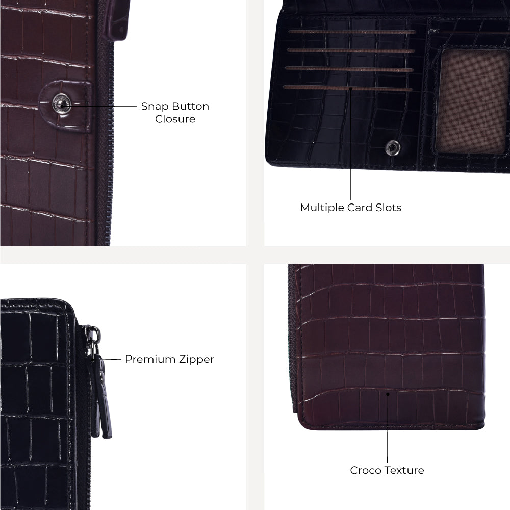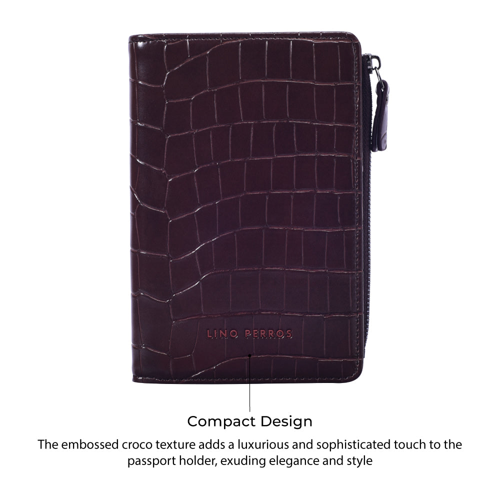 Keep your travel essentials organized with this sleek passport holder from Lino Perros Voyage. Crafted from premium synthetic leather with a sophisticated croco print and smooth poly-blend lining, it balances style and practicality effortlessly. Designed with a compact profile, it comfortably fits your passport while offering 4 card slots, 2 internal pockets, and a zip compartment for added security. The snap button closure ensures your items stay secure on the go, making it an ideal companion for casual travel.