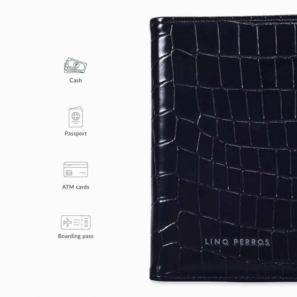 Lino Perros' passport holder collection exudes elegance with its croco printed premium materials and exquisite trims. Designed for modern travelers, it offers ample space and organization with multiple compartments and card slots. Combining style with functionality, Lino Perros' passport holders are the epitome of sophistication for any journey.