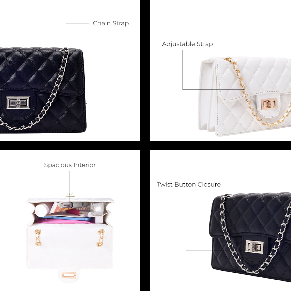 The Maddie Compact Quilted Shoulder Bag strikes the perfect balance between elegance and practicality. Crafted from luxurious quilted leather with a diamond pattern and precise stitching, it offers a timeless silhouette in a convenient, compact size. The gold-tone hardware and adjustable chain-and-leather strap add a touch of refinement, while the flap closure with a magnetic snap keeps your essentials secure.