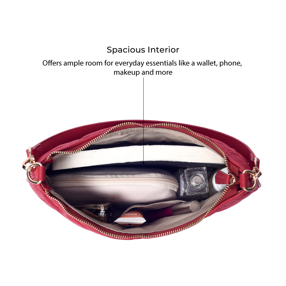 Featuring a single main compartment lined with a polyester blend, the bag includes two internal pockets for organized storage. The top zipper closure ensures your belongings stay secure, while the slim shoulder strap offers comfortable carry options. Its structured build holds shape effortlessly, making it equally suited to casual looks or polished ensembles.