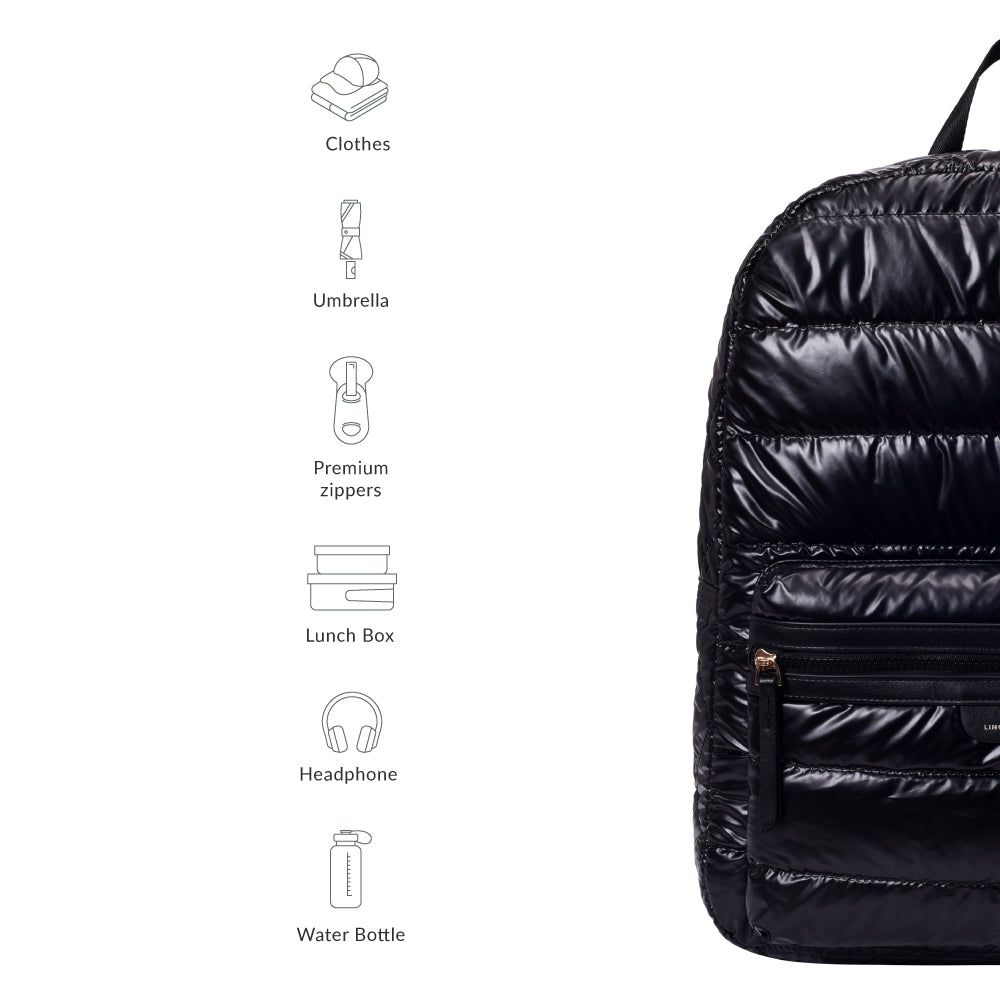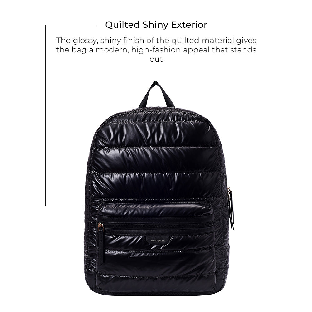 A sleek companion for your everyday routine, this shiny backpack pairs high-gloss polyester with a water-resistant finish to keep your essentials protected in style. Its clean, structured silhouette balances modern design with practical features like a spacious main compartment, multiple zippered pockets, and a padded laptop sleeve. Adjustable padded straps ensure comfort, while the silver-tone hardware adds a subtle, contemporary edge. Ideal for casual outings or busy days, this bag keeps your belongings organized without weighing you down.