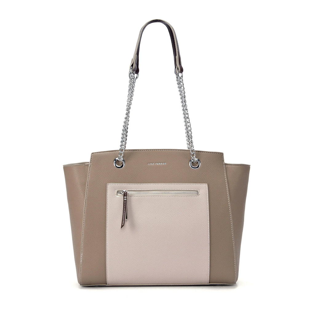 The standout element is its elegant chain-detailed handles, paired with reinforced faux leather straps for comfort and durability, bringing a luxurious touch while ensuring easy shoulder carry.