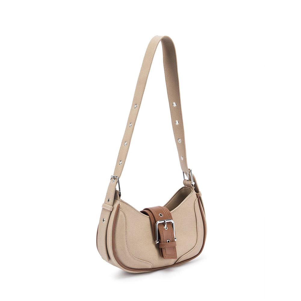 The Monroe Chic Shoulder Bag features a sleek rectangular silhouette with a structured form, perfectly sized for everyday use. Crafted from smooth PU leatherette with a soft matte finish, its neutral beige tone complements a wide range of outfits, from casual to smart-casual. The minimalist design features a secure flap closure with a metallic clasp, adding a subtle touch of elegance. This half-moon structured shoulder bag offers a modern, polished look perfect for casual and smart-casual occasions. With a spacious interior.