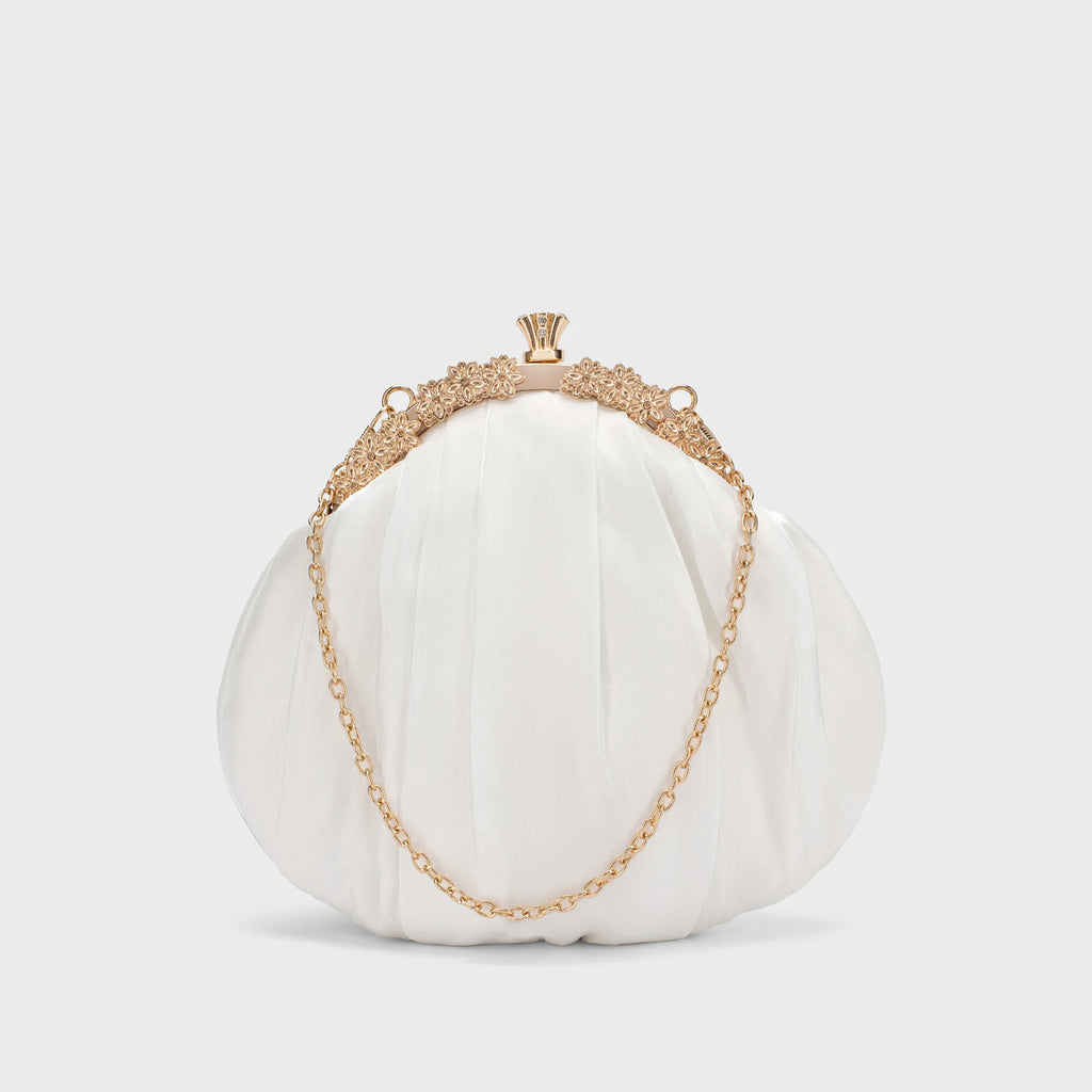The Texas Faye Clutch brings a modern twist to the classic potli. With its gathered silhouette and shimmering finish, it’s designed to sit lightly in your hand while adding a touch of festive elegance to any evening look.