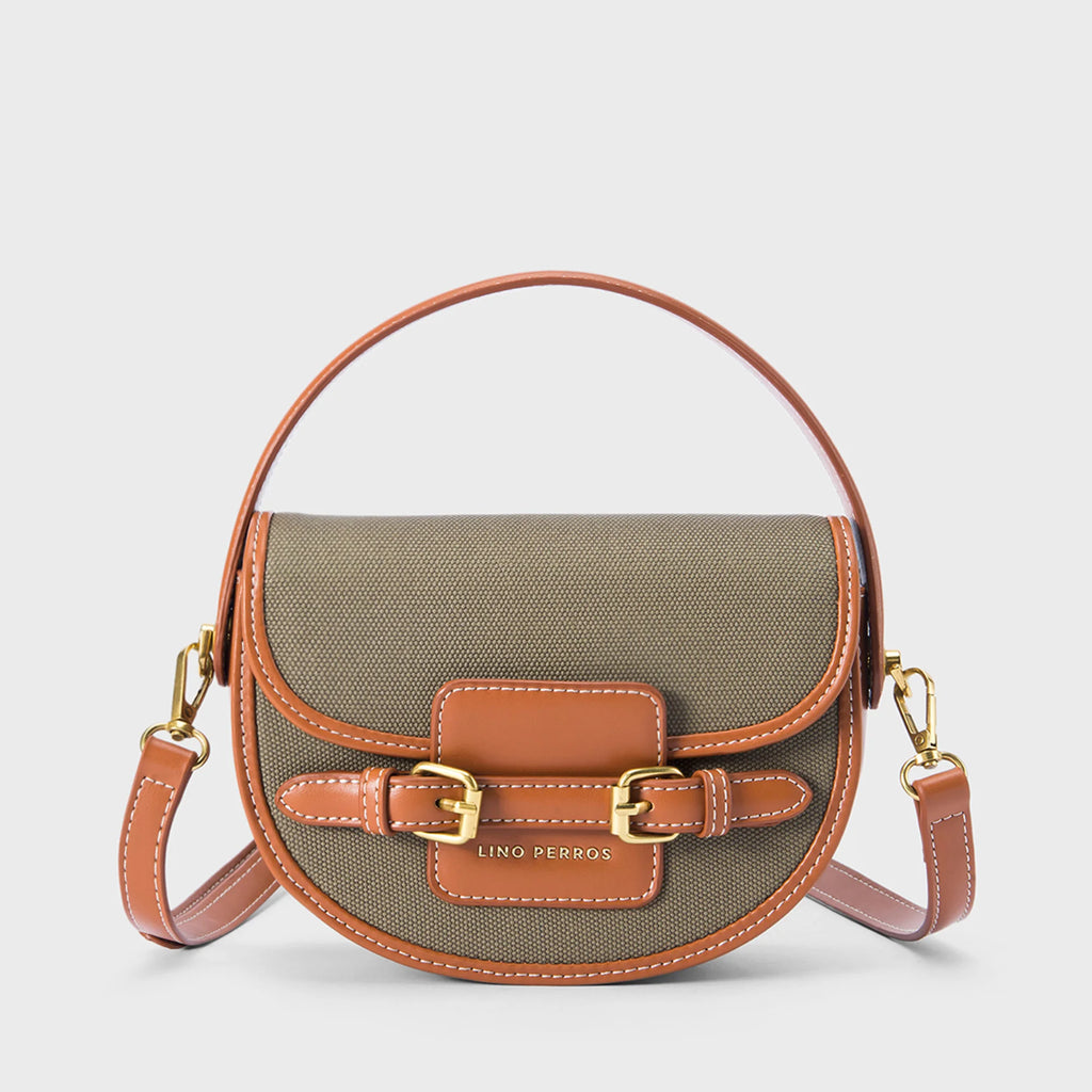 This sling bag features a sleek oval silhouette accented with contrast tan piping, giving it a polished and modern look that effortlessly elevates any outfit.